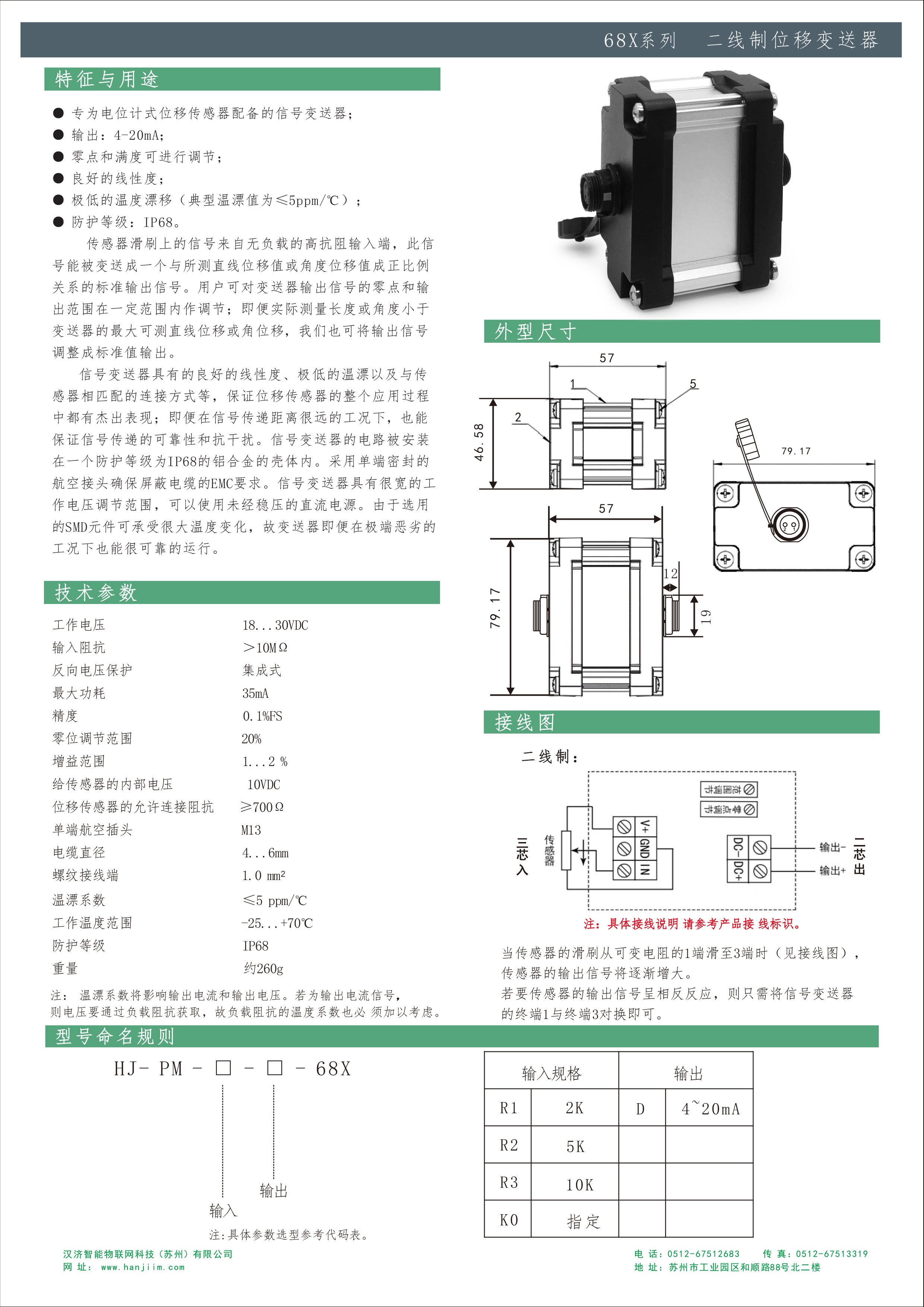專(zhuān)為電位計式位移(yí)傳感器配備的信號變送器; 輸出:4-20mA; 零點和滿度可進行調節; 良(liáng)好(hǎo)的線性度; 極低的(de)溫度漂移(典型溫(wēn)漂值為≤5ppm/℃); 防護等級:IP68。